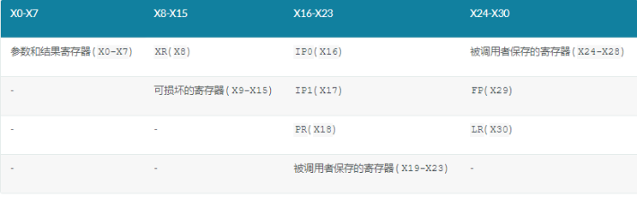 函数foo()可以使用的寄存器,且不需要保存的寄存器是X0-X15,但如果foo()要使用X19-X28必须先将其保存到堆栈中,然后在返回之前从堆栈中恢复。