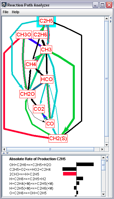 为了帮助您获得关键动力学的关联关系,CHEMKIN-PRO提供了反应路径分析。反应途径分析工具采用交互式、可视化的显示界面,清晰显示主导反应的路径,从而为机理的开发和机理简化提供了手段。