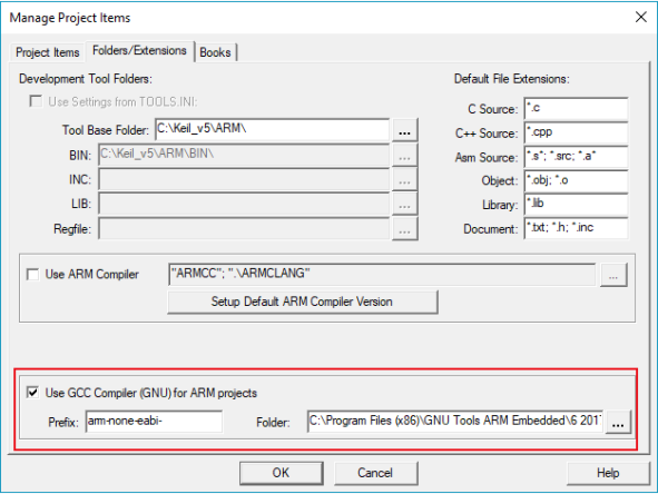 2、在KEIL中打开Manage Project Items。切换到Folders/Extensions栏,选择勾选”Use GCC Compiler(GUN)for ARM project”,切换到使用GCC工具链。(如图1)