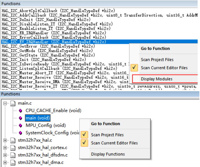 2)、右键点击<Functions>界面,点击“Display Modules”恢复文件形式查看,选择“Scan Project Files”和“Scan Current Editor Files",分别扫描项目文件和编译器文件。点击“Go to Function”或双击可以跳转到该函数。