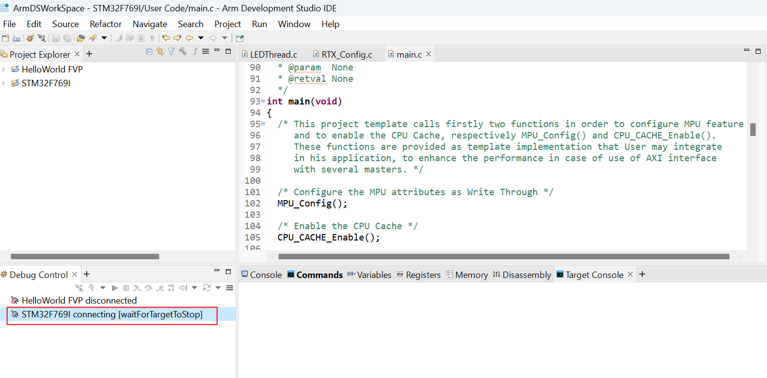 解决ArmDS在开发Coretex-M处理器时,进入调试模式时,PC指针无法到达入口地址处,在调试控制窗体中,一直在等待目标设备停止(waitForTargetToStop),如图2-1所示: