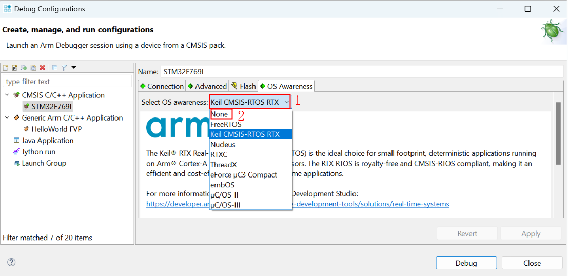 1)、打开调试配置窗体,在“OS Awareness”中,选择“None”,保存设置,如图4-1所示: