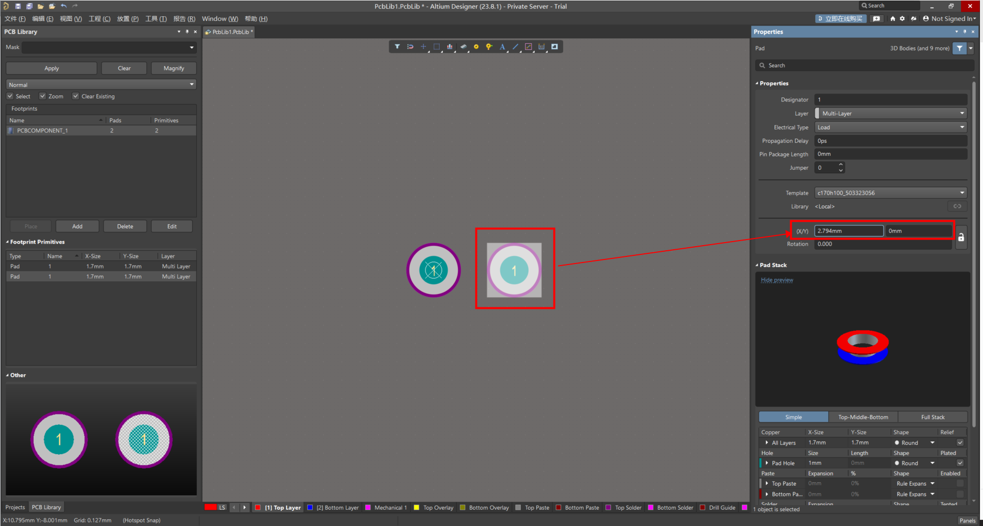 这里只需要将两个焊盘重合放置,利用位移工具,菜单栏下【编辑】->【移动】->【通过 X,Y 移动选中对象】(快捷键 M)
