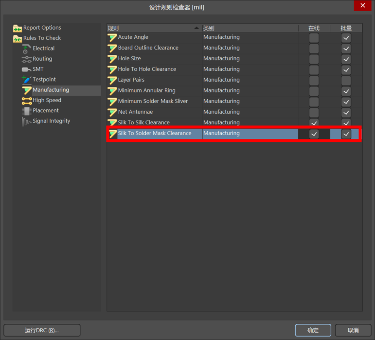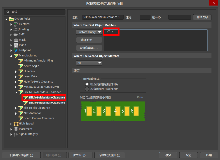 快捷键 DR 打开规则编辑器,在Manufacturing →Silk To Solder Mask Clearance 下新建规则,在查询语句中填写 IsVia,设置规则作用对象。