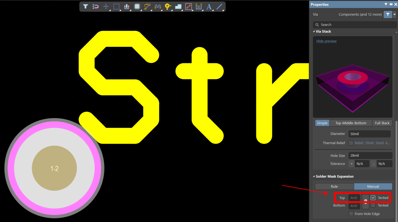 需要注意不要给过孔设置绿油,不然该规则无法适用。增加绿油相当于给过孔盖上一层膜,做出的 PCB 不会影响丝印的显示。