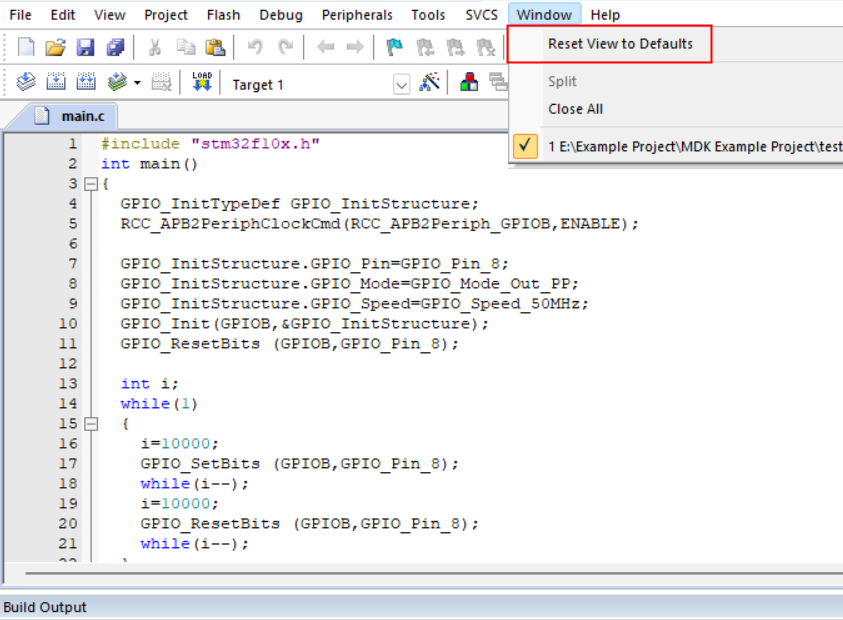 启动Keil后,通过顶部菜单栏依次选择:Window → Reset View to Defaults