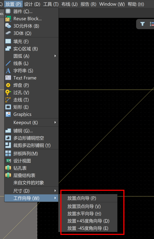 在PCB编辑界面中,通过命令“放置”-->“工作向导”可以放置参考点和参考线。
