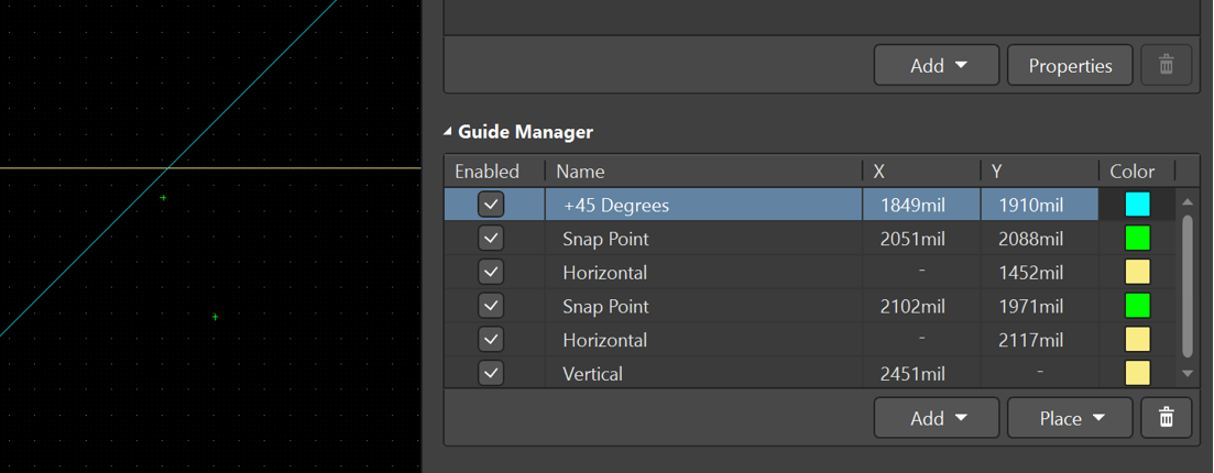 放置完需要的参考点和参考线之后,在PCB属性面板的Guide Manager中可以看到参考点和参考线的坐标和颜色,在这里可以对它们进行修改。也可以通过Guide Manager的“Add”和“Place”来进行添加和放置。
