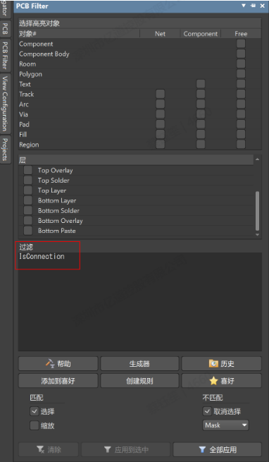 通过PCB Filter可以快速找到未连接的网络,并且以高亮显示显示,方便工程师连接布线。方法很简单,打开PCB Filter面板,在“过滤”栏直接输入“IsConnection”。