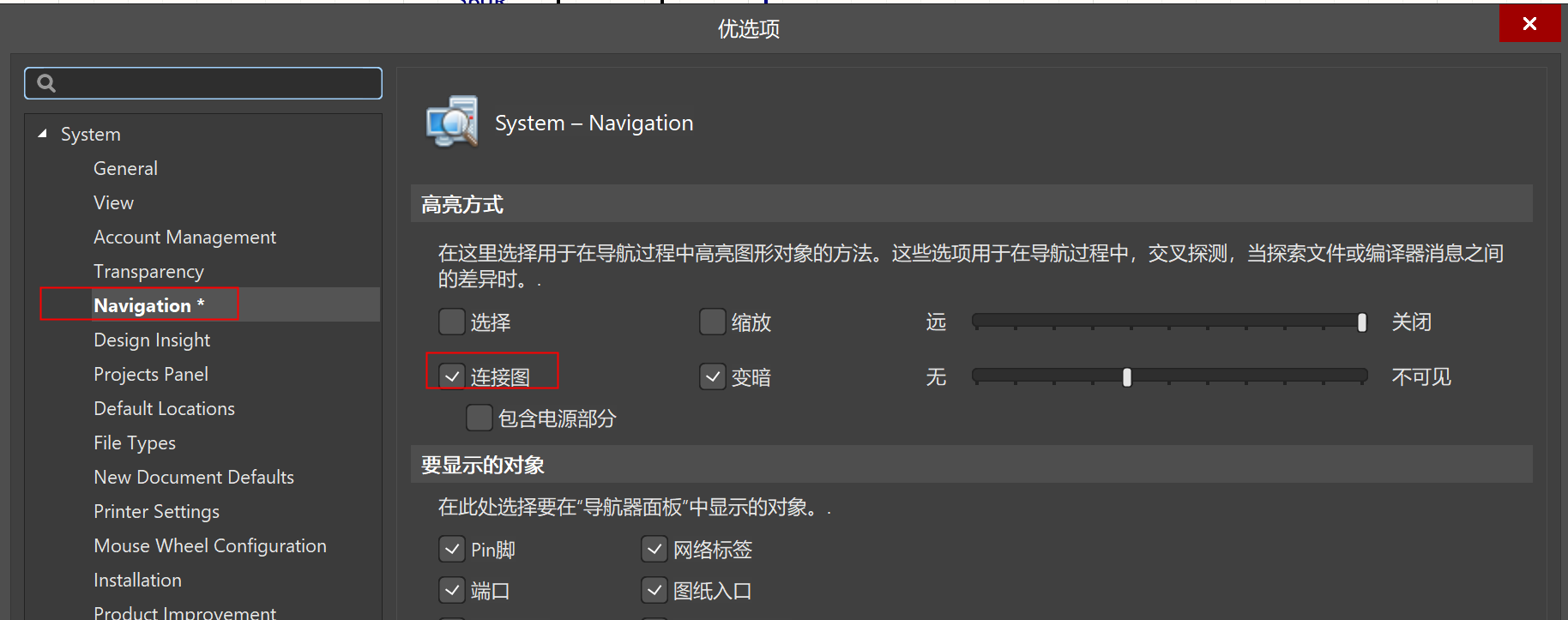 1)、打开有选项设置,找到Navigation设置,勾选“连接图”。