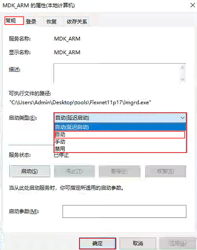 注:客户服务器端开机未自启动,检查3.2处已勾选,在服务器端找到创建的MDK服务,右键进入服务属性后点击“常规”,在目标栏内找到启动类型,选择“自动”后,点击确定再次重启服务器,服务会自动启动。