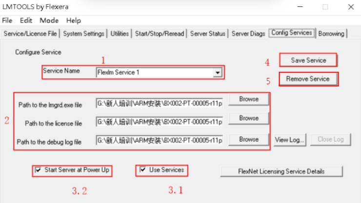 如图4-4所示,标记1:处列出许可证服务器计算机上的所有 FlexNet 许可证服务。