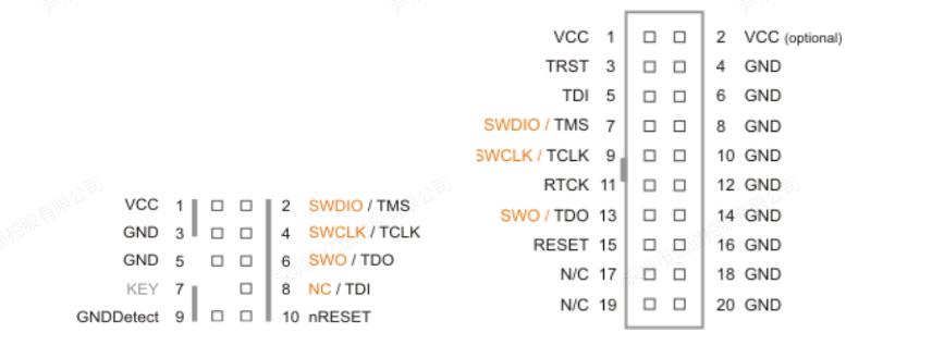 4)、推荐使用标准JTAG(图2 10pin/20pin)进行调试,当使用四线SWD接口进行调试时,会有一定概率出现这种故障情况。推荐使用ULINK或JLINK等正版调试器。