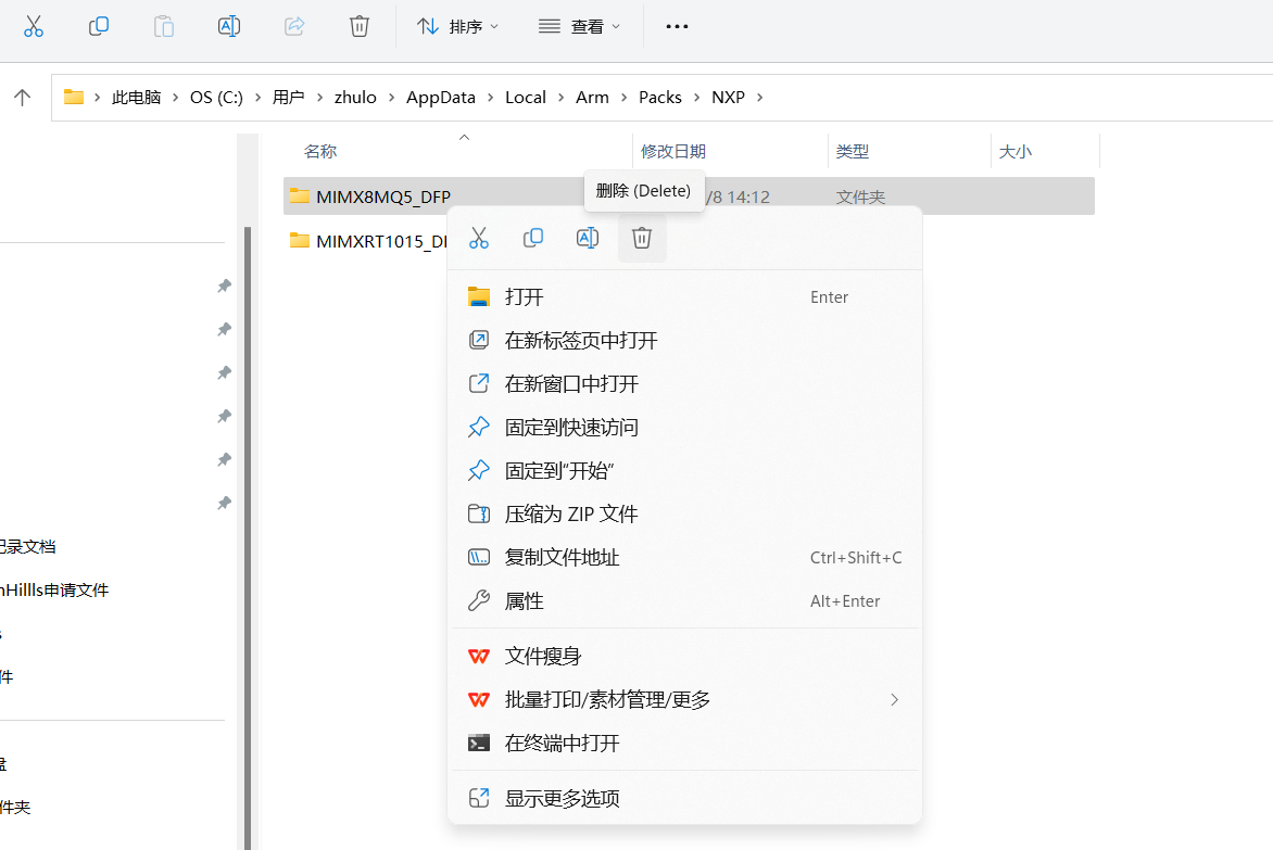 移除操作:进入PACK下载路径,找到NXP的pack包的存放路径,移除该芯片文件夹,报错解除