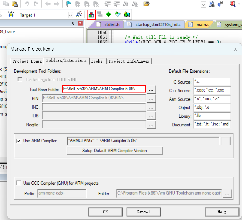 3)、进入“Manage Project Items”界面后选择“Folders/Extensions”, 在Tool Base Folder内选相关的文件路径,将路径修改为“E:Keil_v538ARM”后点击“OK”,再进行烧录可以成功烧录。