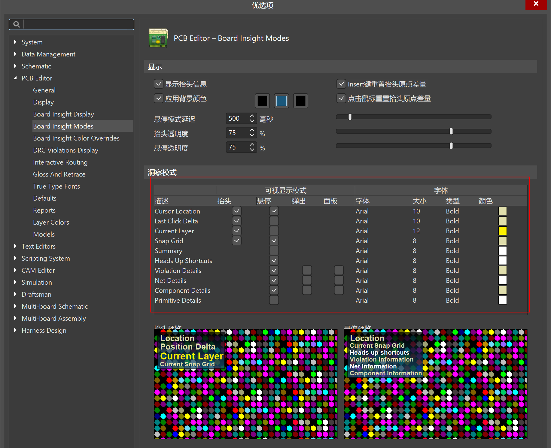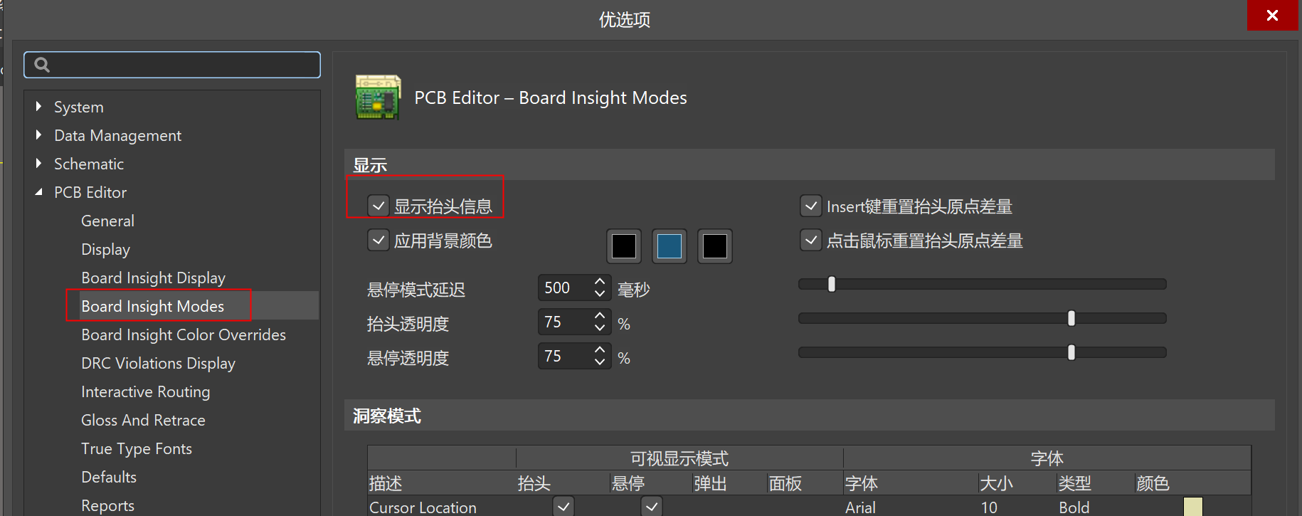 1)、在优选项设置中,找到PCB Editor-Board Insight Modes,通过勾选/取消勾选“显示抬头信息”可以将抬头显示悬浮窗口设置为显示或隐藏。也可以直接使用快捷键"Shift+H"来实现。