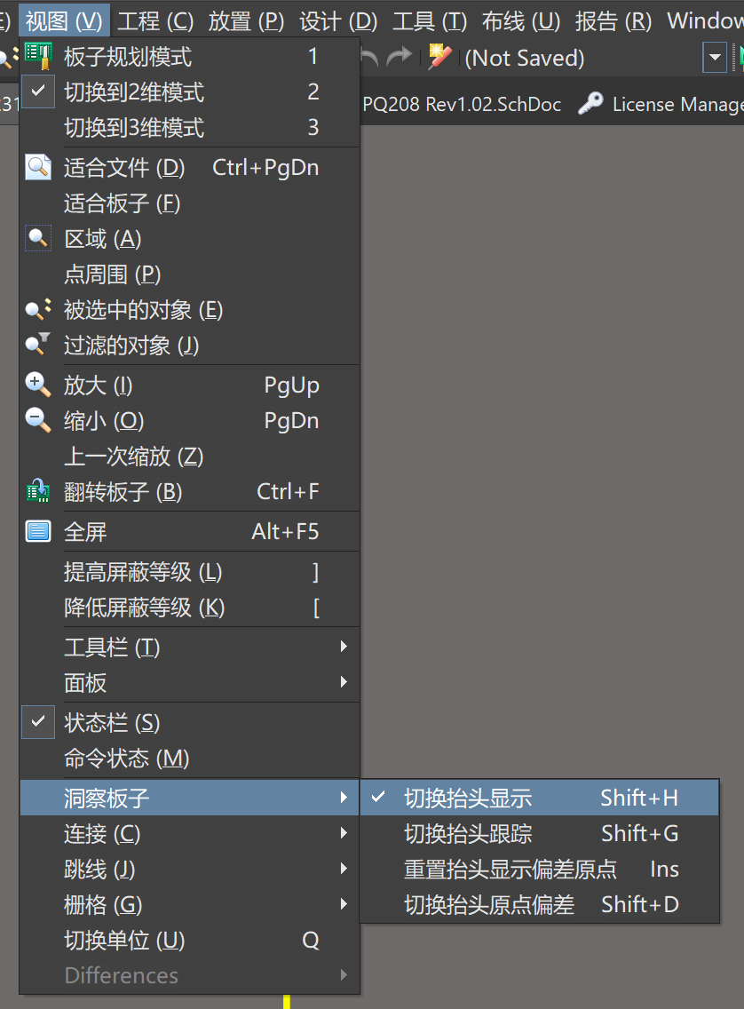 3)、打开菜单中的视图-洞察板子,也可以看到针对抬头显示悬浮窗口设置的快捷键,“重置抬头显示偏差原点”和“切换抬头原点偏差”这两项在设计中一般用不着。