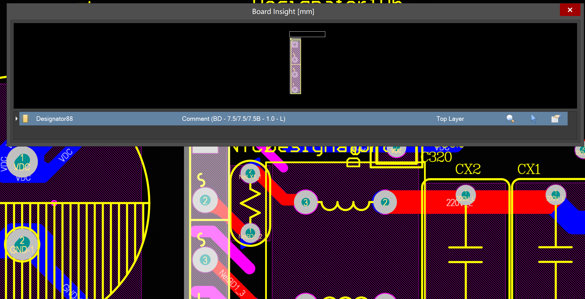 4)、在优选项设置的PCB Editor-Board Insight Modes中,通过更改“洞察模式“中打勾的选项,可以调整抬头显示悬浮窗口显示的信息。此处有个小技巧,勾选了“Net Details”和“Component Details”,在PCB上选择某个对象时,按快捷键"Shift+X"可以打开其Detail窗口,如图5所示,通过此窗口可以对其进行放大、选中、打开属性窗口这三项操作。"Primitive Details"不建议勾选,勾选此处悬浮窗口会显示鼠标悬停位置所有内容信息,导致显示内容过多,影响视觉,见图6.