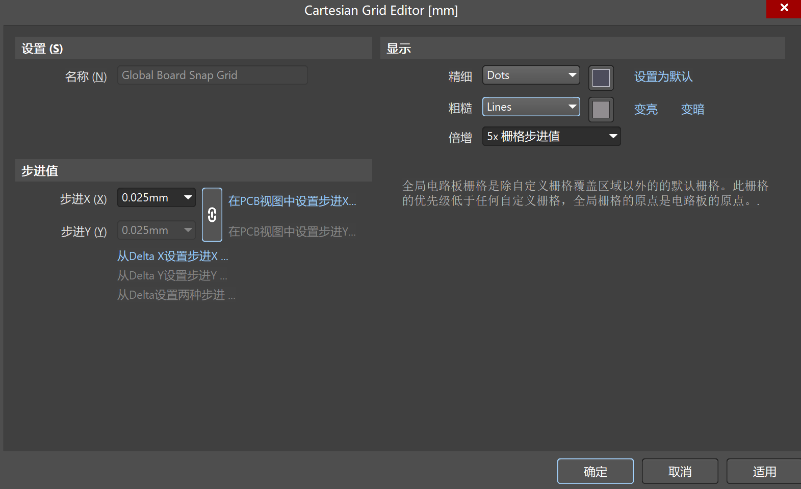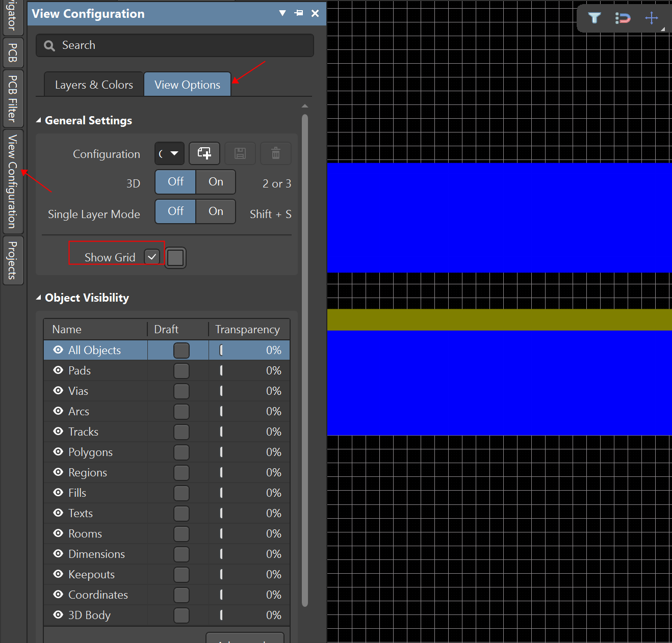 PCB设计中,可以对栅格进行设置大小,用以辅助布局布线。有时候因为误操作会把栅格隐藏,或者拿到别人做的PCB文件进行修改,原设计人员将栅格隐藏了,又不知道怎么设置才能显示栅格。