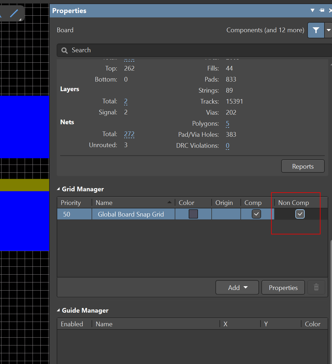 3)、在Board属性中找到Grid Manager,查看"Non Comp"是否打勾,打勾显示栅格,取消打勾不显示栅格,如图3。此处设置直接受1、2两处影响,当1、2两处设置为不显示,在此处勾选了也不会显示栅格。