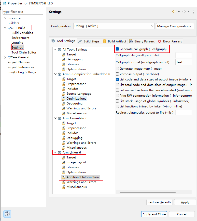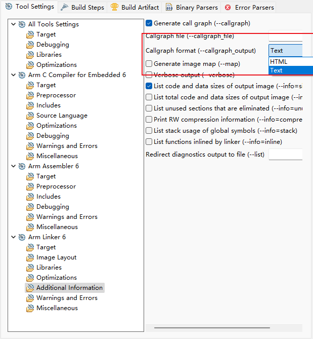 1)、可以通过对应工程的Properties窗口中,C/C++ Build->Setting->Arm Linker 6->Additional Information配置中,有一个Generate call graph(--callgraph)的选项(如图4-1)。这个选项可以生成记录工程函数的调用关系的文件。