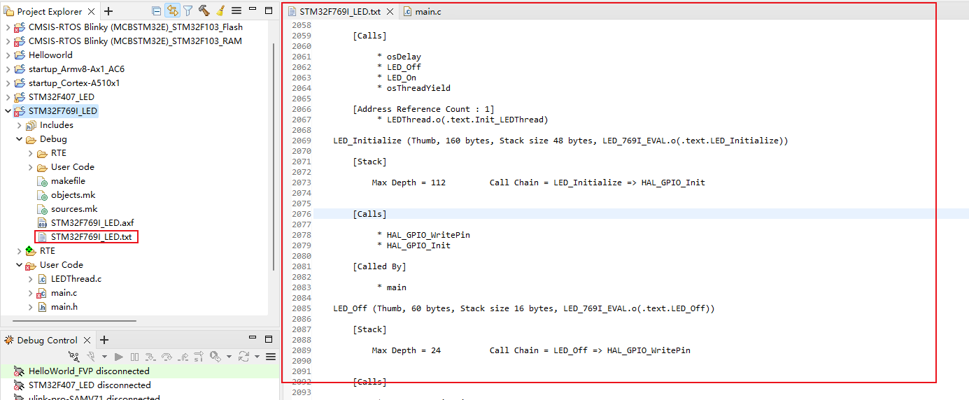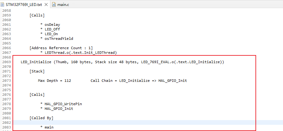 3)、在生成的文件中,可以看到在工程中使用的LED_Initialize函数的调用情况和堆栈情况(如图4-3)。