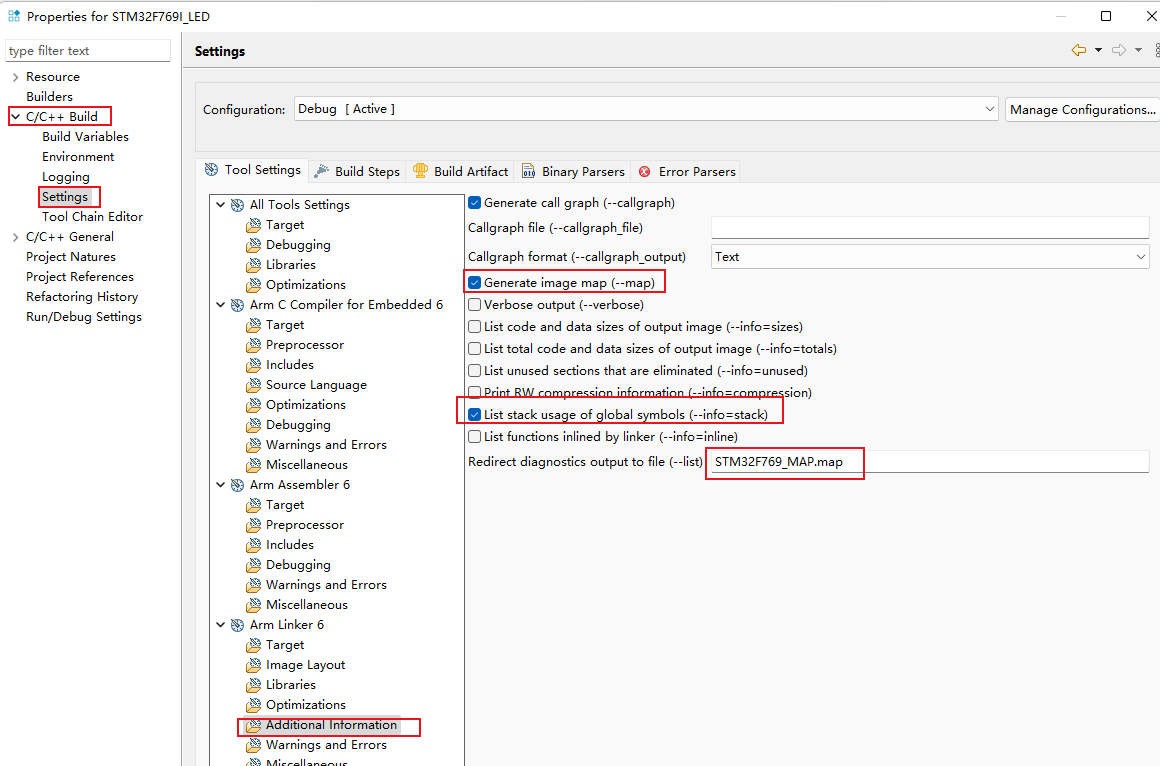 1)、Arm DS要生成Map文件需要在Properties窗口中,C/C++ Build->Setting->Arm Linker 6->Additional Information配置中,勾选Generate image map(--map)。并且在最下面的Redirect diagnostics output to file(--list)后面的输入框中输入map文件的文件名(如图4-1)。