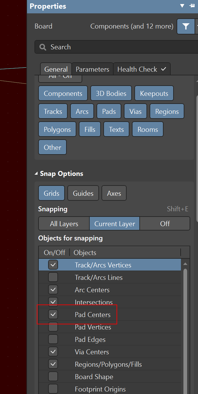 在PCB环境下,不要选中任何对象,打开属性框,此时显示的是整个PCB板的属性。找到Objects of Snapping,看一下Pad Centers是否打勾。Objects of Snapping控制的是列表对象是否可以别自动捕捉,当Pad Centers打勾时,可以自动捕捉到焊盘中心,没有打勾则不能。