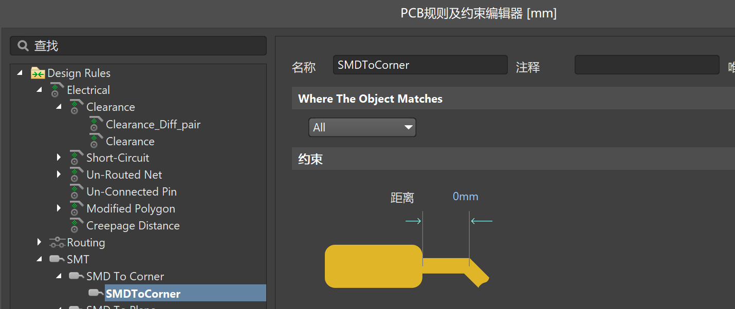 在PCB规则的SMT中,有一项SMD to Corner,按照图示解释,可以设置一段距离,具体是什么作用。