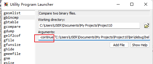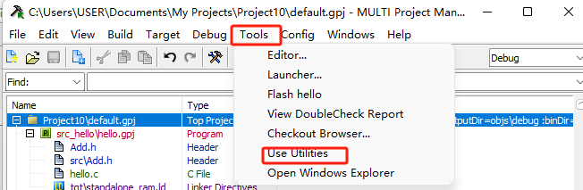 2)、想要使用这个命令的话,可以在MULTI Project Manager窗口中的Tools->Use Utilities打开Utility Program Launcher窗口使用到gbincmp这个执行程序。(如图4-1和图4-2)