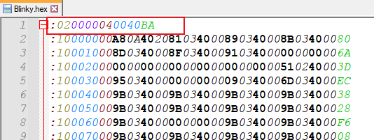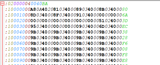 (1)、HEX文件的开头第一行(如图4-3-1):“:020000040040BA”