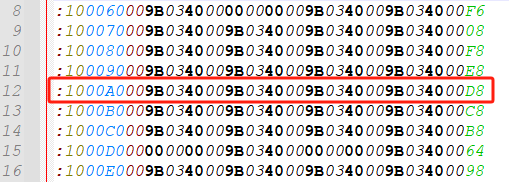 (2)、HEX文件的中间的数据行(如图4-3-2):“:1000A0009B0340009B0340009B0340009B034000D8”