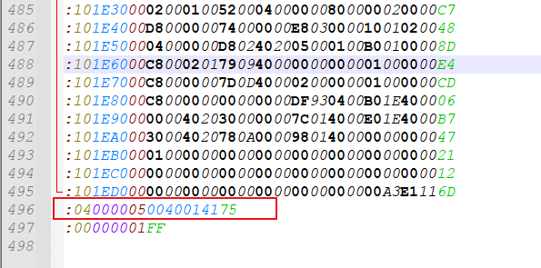 (4)、Hex文件的倒数第二行数据(如图4-3-3-2):“:040000050040014175”