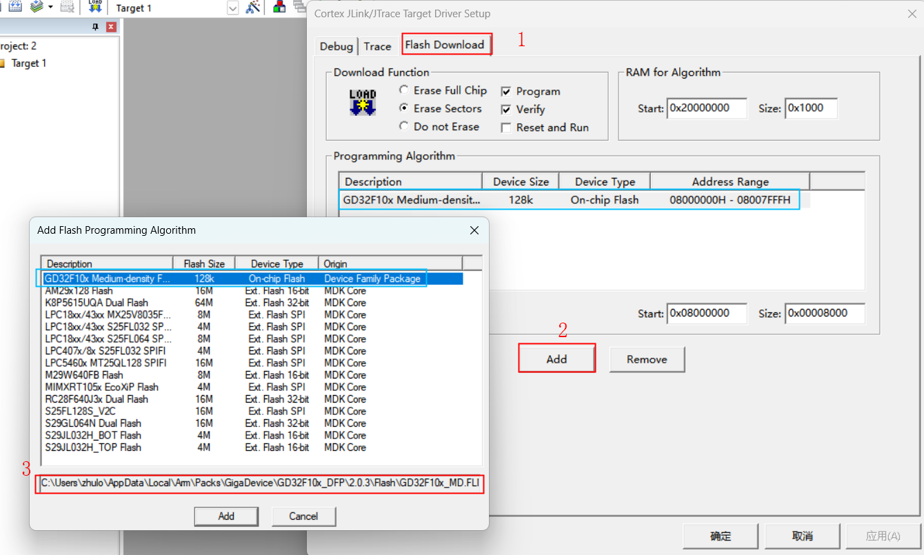 2)、在IDE中打开配置界面,进入“Flash Download”界面、点击“Add”、查看该芯片的烧录文件、下方有该文件的存放位置。