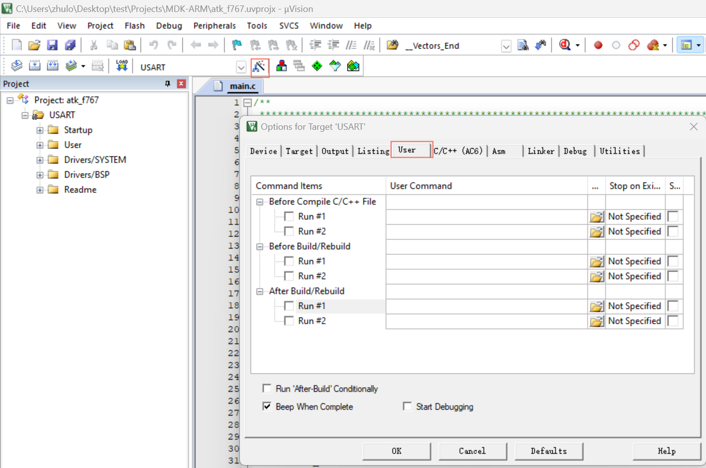 1)、首先打开keil软件,本示例工程名称为atk_f767,确保该工程可成功编译后,点击“魔法棒”进入Options界面,选择“User”进入配置界面。