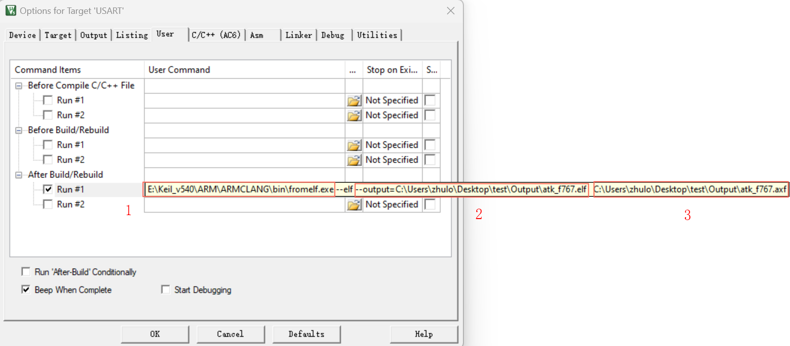2)、在User界面选择“After Build/Rebuild”勾选“Run#1”, 在执行框内输入如下命令E:Keil_v540ARMARMCLANGbinfromelf.exe --elf --output=C:UserszhuloDesktoptestOutputatk_f767.elf C:UserszhuloDesktoptestOutputatk_f767.axf