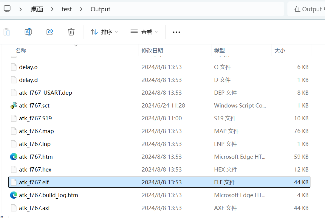 3)、点击编译后,在相应的文件夹下生成atk_f767.elf文件。