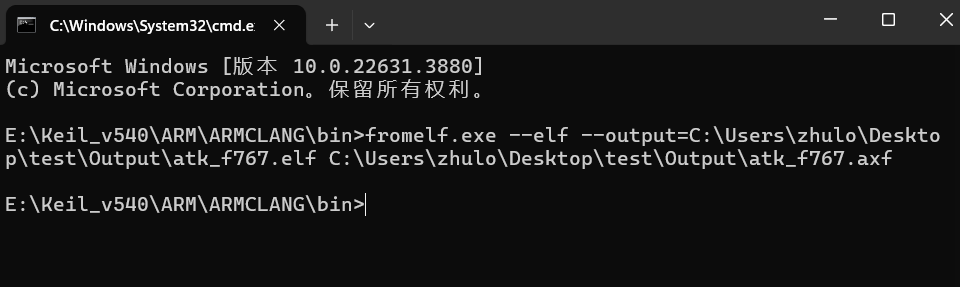 “C:UserszhuloDesktoptestOutputatk_f767.axf” 指定输入文件路径。