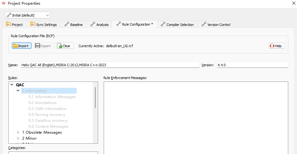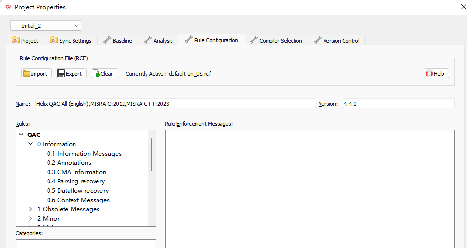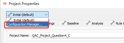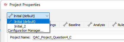 4)、然后,就可以在Project Properties窗口的左上角去切换属性的配置方案(如图4-4-1)。两个配置方案的相关配置更改不会影响另外一个配置方案。如图4-4-2中所示,在Initial方案中禁用了QAC规则的第0等级规则。而如图4-4-3中所示,在Initial_2方案中是没有被禁用的。