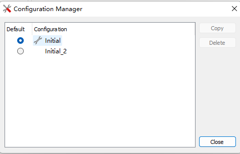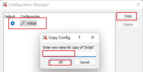 3)、打开Configuration Manager窗口后,可以看到目前只有一个Initial一个工程属性配置方案。可以通过点击Initial,然后,点击Copy。就会出现Copy Config的窗口,在这里输入新的工程属性配置方案的名字,例如Initial_2,就会将Initial方案复制生成Initial_2方案。(如图4-3-1和图4-3-2)