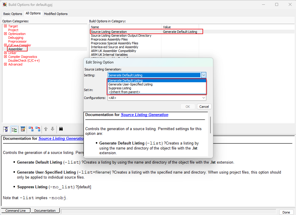 (1)、在Build Options中,Assembler->Source Listing Generation配置可以生成对应的汇编列表信息。该配置有三个选项: