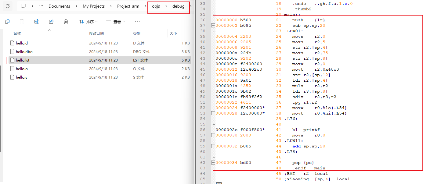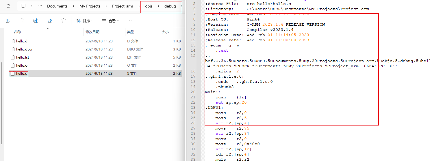 生成后,就可以在工程目录下,查看到对应的.s文件,里面也包含了汇编信息。