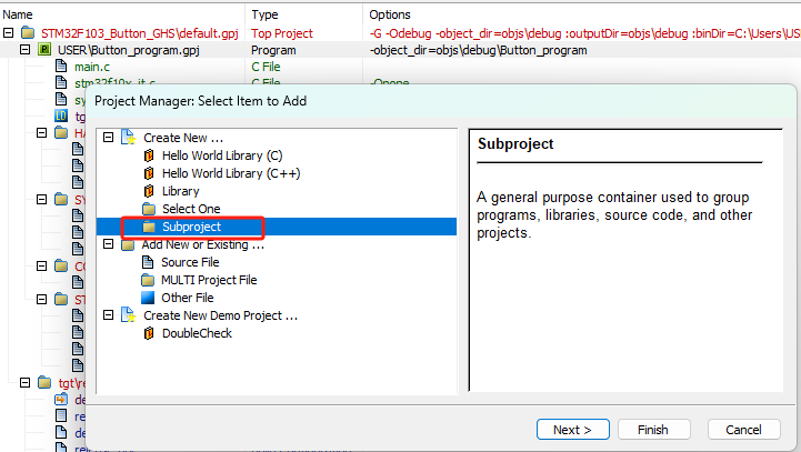 用户目前已经有了相对完整的工程源代码。各类文件也比较多。想要在GHS中搭建完整工程。但是,一个一个地将文件添加到工程目录中效率太慢了。用户希望可以自动地将工程中源文件或者某一个类型的文件自动导入到工程目录当中进行搭建工程。