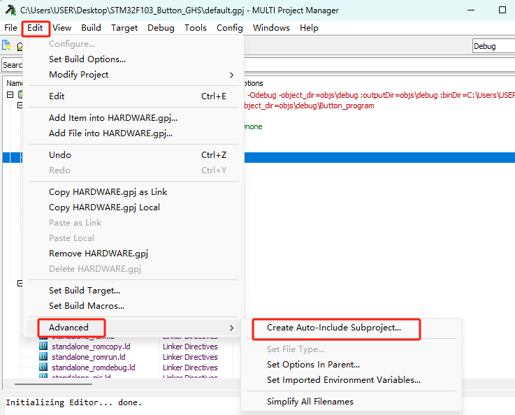 2)、创建好Subproject后,选中创建好的Subproject,在菜单栏中选择Edit->Advanced->Create Auto-Include Subproject。(如图4-2)