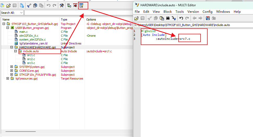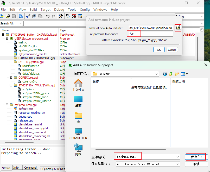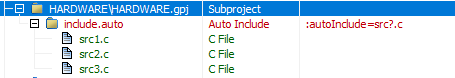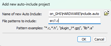 6)、如果在工程目录下,想要导入具有统一命名格式的文件,例如:src1.c、src2.c、src13.c这样的。可以在Add new auto-include project窗口中的File patterns to Include中输入"src?.c"。(如图4-6-1)用“?”表示通配符,只要是src开头的C文件都会导入进来。(如图4-6-2)