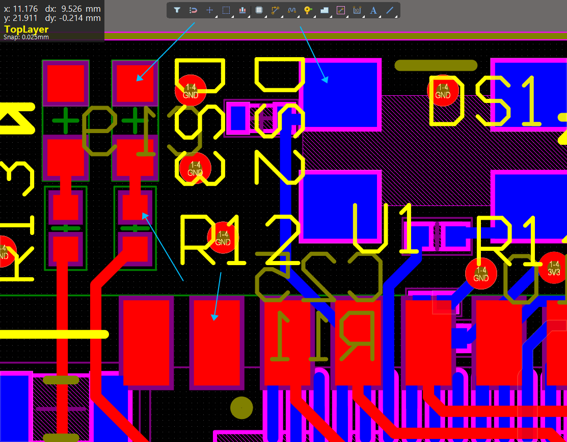 在 PCB 界面下,发现焊盘的不显示标号和网络名称。下图箭头所示,顶层或者底层焊盘都没有信息显示。