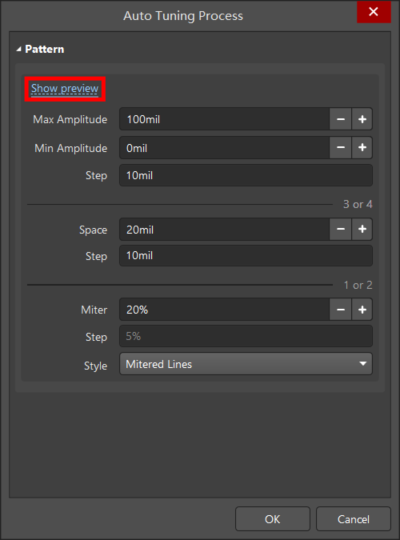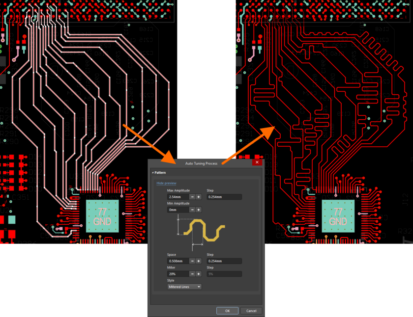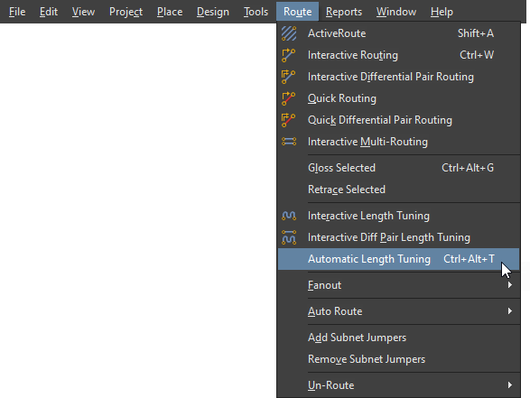 从主菜单中选择【Route】→【 Automatic Length Tuning】 快捷键:Ctrl+Alt+T