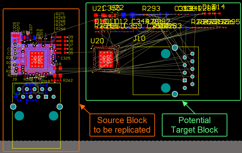 PCB布局复制工具使您能够在平坦 PCB 设计中复制重复电路块的布局。作为非正式的重用功能,当您需要将一组组件的放置快速复制到另一组具有相同连接的相同但尚未放置的组件时,此工具非常适合。