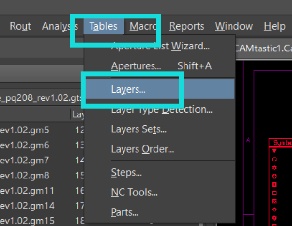 9.查看过图8之后,我们可以回到CAM文件界面,点击Tables>>Layers进入层分配界面,操作见图9: